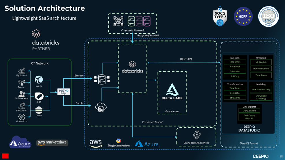At the heart of our offering is a secure, lightweight SaaS architecture optimized for Databricks Lakehouse.  Through native integration with Delta Lake, Databricks APIs, and real-time ML pipelines, DeepIQ enables customers to ingest, model, and act on time series, geospatial, and relational data with domain-specific precision.  Our DataStudio and CoPilot (Word Plug-In) solutions empower engineering teams to accelerate workflows in well planning, refinery optimization, and ESG reporting, all from within familiar tools and environments through our Industrial DataOps platform, powered by contextualized AI and native Databricks integration.