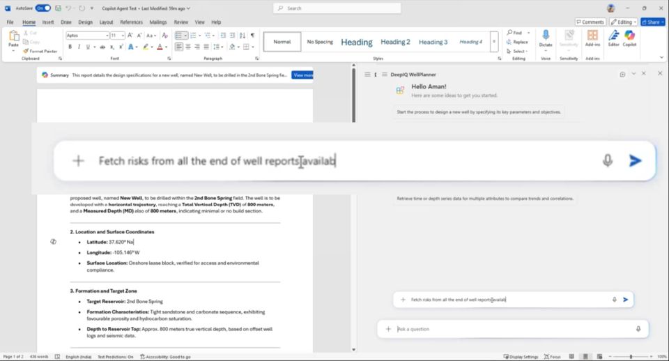 The DeepIQ Word Plug-In, known as CoPilot, is a domain-specific AI assistant purpose-built for drilling and well engineering teams.  Integrated directly into Microsoft Word, CoPilot connects users to DeepIQ’s industrial knowledge graph and Databricks-native data pipelines, automating the generation of high-quality technical documentation, including drilling data, offset analyses, risk assessments, and post-well reviews.