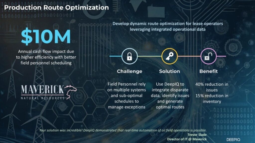• $10M annual impact through AI-driven field route optimization and exception handling with Maverick Natural Resources