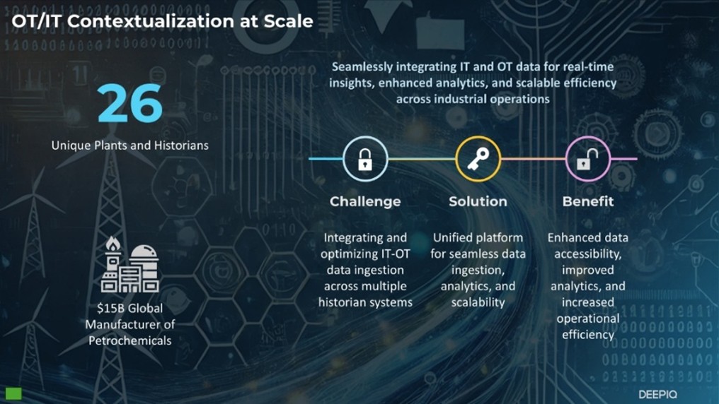 DeepIQ is currently partnering with a $15 billion global petrochemical manufacturer to scale OT/IT contextualization across 26 unique plants and historian systems, utilizing Databricks as the central data and analytics engine.  The solution consolidates diverse sources of time series and enterprise data into a unified platform that enables seamless ingestion, transformation, and analytics.