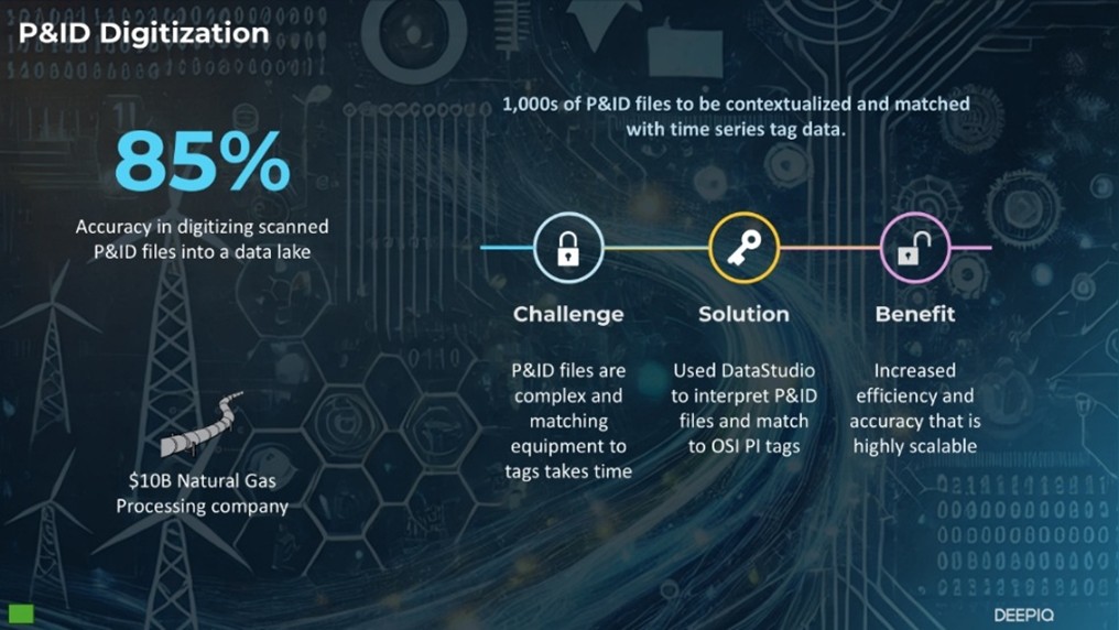 DeepIQ collaborated with Databricks on a joint initiative to digitize scanned P&ID diagrams for a $10B natural gas processing company.  The project aimed to extract and contextualize equipment data from complex engineering drawings and align it with real-time OSI PI tag data.  Using DeepIQ DataStudio and Databricks’ scalable Lakehouse platform, the team created a pipeline that interprets image-based P&ID files, identifies key entities, and links them to operational time series data.