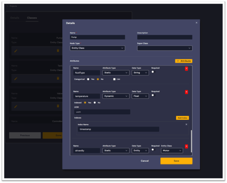 While the above UI shows a manual way of creating the knowledge graph schema, DeepIQ provides extensive support for generating these schemas automatically using existing data sources such as OPC UA hierarchies, AF template classes or external OWL ontologies.