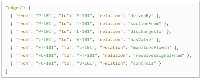 | Pump P-101: dischargesTo→ PipelineSegment L-101 | Fluid discharge |